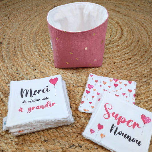 Lot de 8 cotons lavables et panier - "Super Nounou"